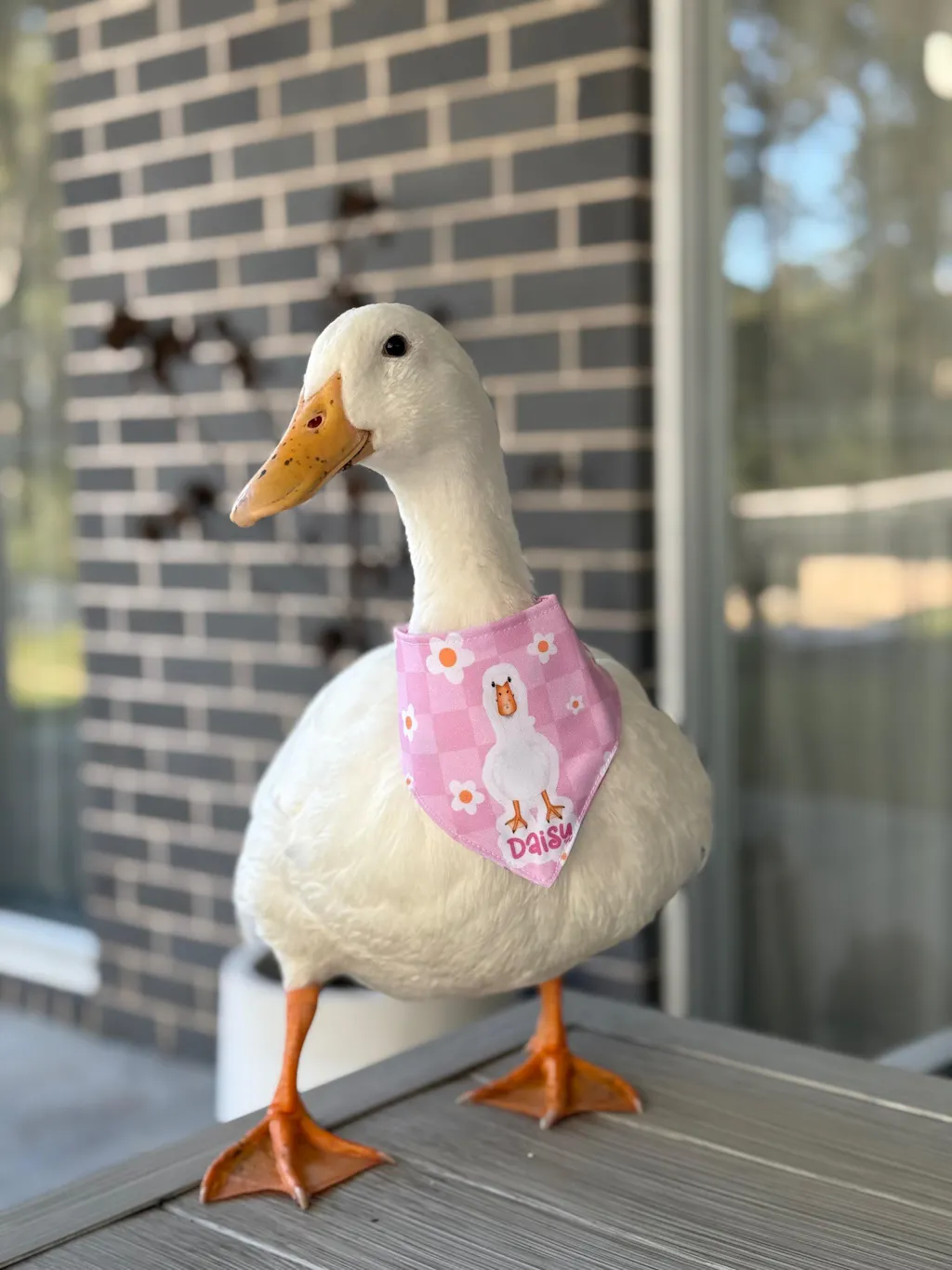 Got a bandana made for our pet duck Daisy. It’s absolutely amazing and looks so cute on her.